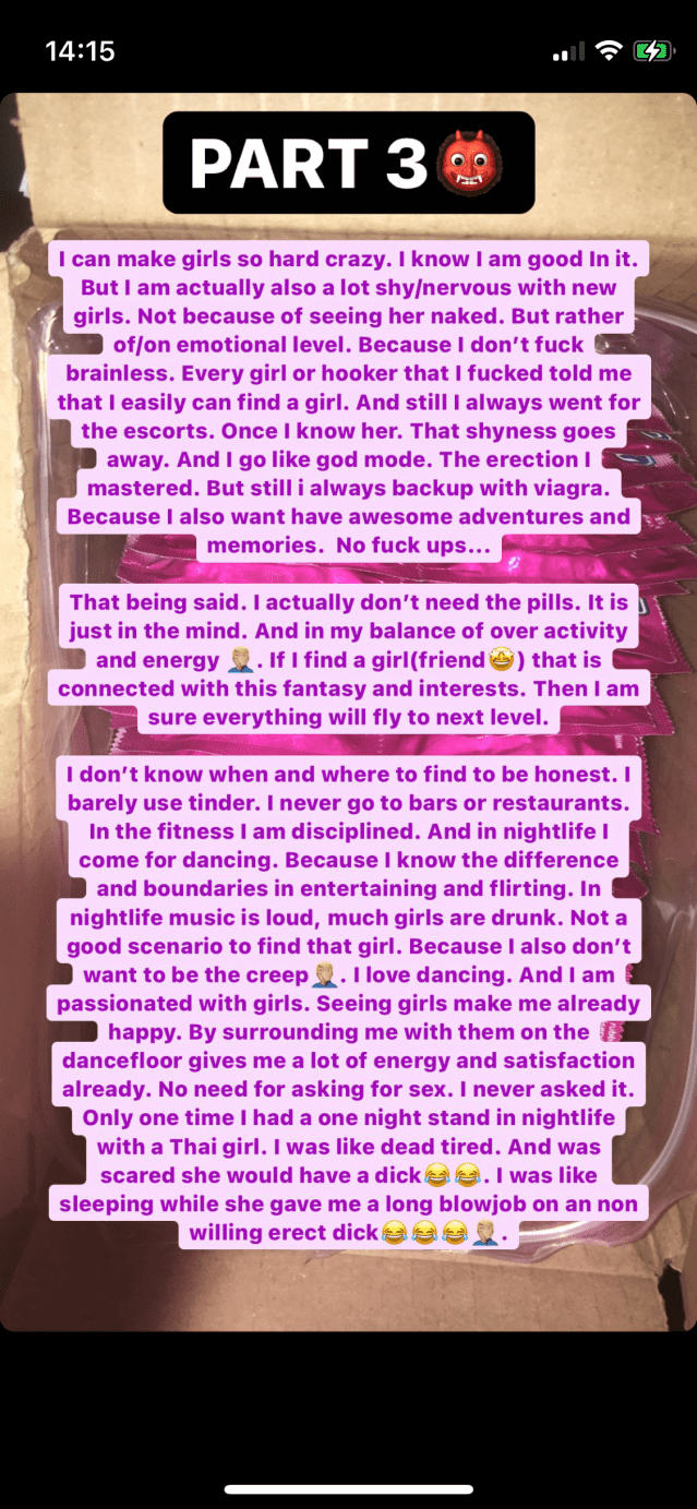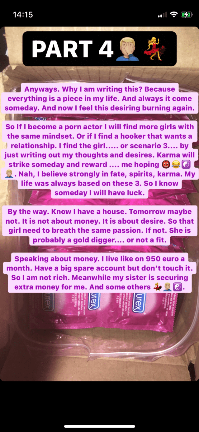 I went on an casting completely in rush. I was too tired. I realized it was not the right moment. I was mad and disappointed after that fuck up. I couldn’t believe it in the first place. I directly went the next day to an hooker to release my disappointment feelings. To energize me again. Sure I had erection disorders due sexual trauma. And due seeing girls forced in prostitution. Due getting faced with an girl as a prostitute that turned out to be younger then 18. 16 wtf! I directly canceled it and reported it to the police. Also some girls begged me to help them. They were under fear. The police was scared of these gangs. And I thought to play the hero by going on my own to set her free🤦🏼♂️. Result: an psycho pimp behind me. Me with an broken heart that I could do nothing. Next to that 2015 was just an insane moment. My first girlfriend experience was really not the best to say at least. She had multiple personality disorders, a lot of shit and threats, delusions. I played psychologist 2 months for her because I felt for the first time love with an non hooker. Because my first love was actually with an hooker. I learned that sex can trigger endorphins/emotions/love etc, the hard way. Anyways, where was I… Right. That girl of me. Well we had public sex, she was slutty, horny, we had both interest in bdsm and the whole kamasutra. So it was all worth it next to the negatives I thought. I mean September 2014- 2015 was probably the most stressful period in whole my life. So I really could use a fuck. I ignored 200+ woman who had interest in me. Was always focused. But in may 2015 somebody gave my number without permission of me to her. And that is how it started. We were both horny, hyper sexual, nymphomaniac. But after a few weeks I knew it would be nothing more then just an fuckbuddy. But still I attached me too much in her personal situation. She fucked up my mind. And I had enough from women. The heck even escorts. I couldn’t stand the pain, was confused, mad, exhausted, etc. I only could figure out that later. Even the police needed to stop her obsessive stalking. She would create other accounts or cell phone numbers. Would try to excuse her. But I had enough of it. And didn’t accept it. So the police was the only way that she would take some space of me. Because she was just lost in her mind. That time period I learned another different side of girlfriends. Wtf. I wanted this. But I was not ready for such an mental mindfuck I guess. I lost my virginity by an escort, learned everything there, went already one year to the escorts. Still I never searched or chased for an girlfriend and then this. It was just insanity. There were times that she was just waving with an huge kitchen knife in front of me, in trance and anger. Just one of her so many panic attacks/blackouts. Plus she had no limits. And I needed focus. So yeah. My erection was over and out. I had enough of women. I thought love will never exist in my life after this crazy period.